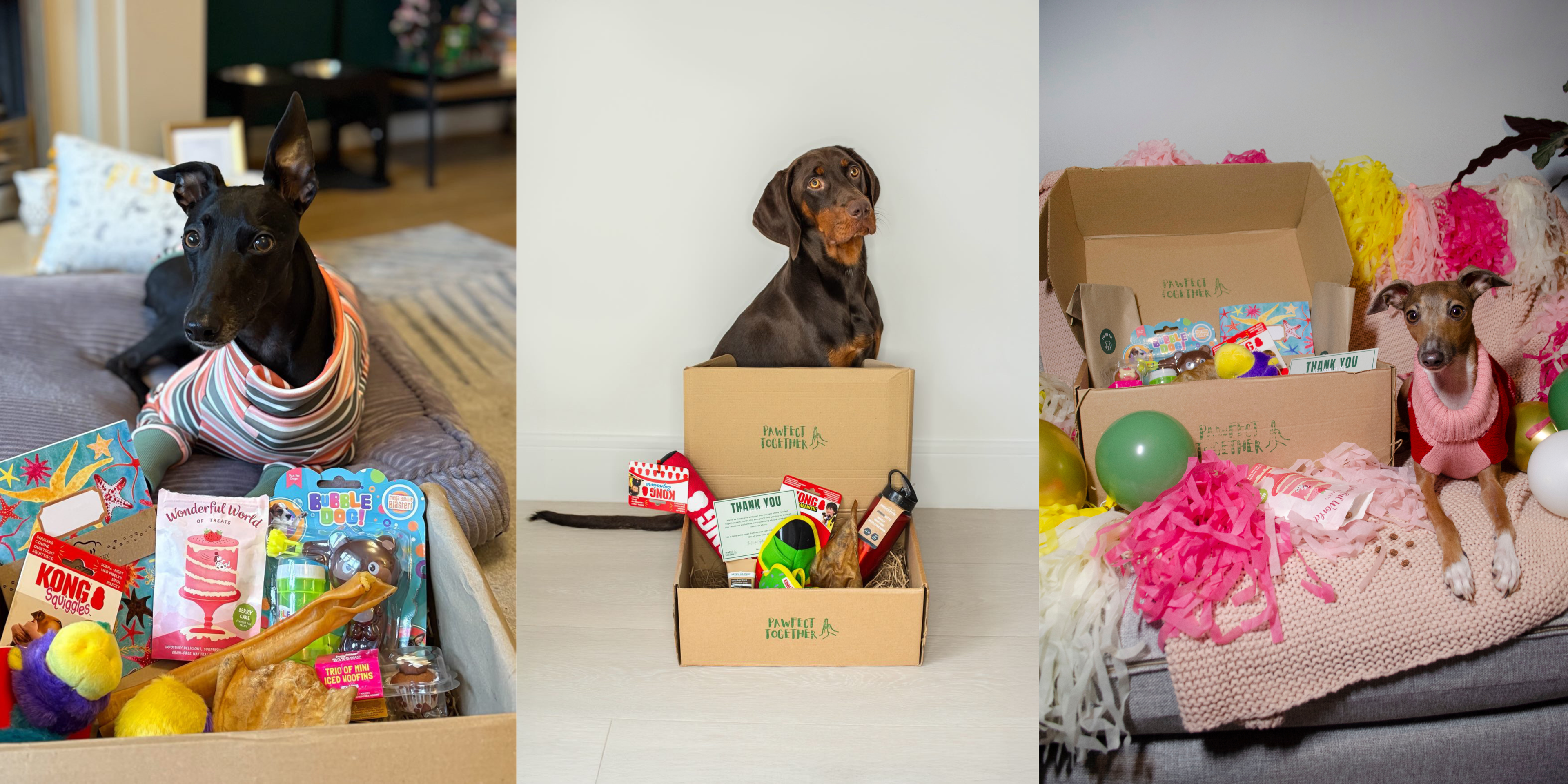 Pawfect Together is a UK-based gift and subscription box service delivering one-off and monthly themed boxes for dogs and their owners. Each box is filled with delightful toys, treats, and goodies, ensuring a tail-wagging delight for you and your furry friend!